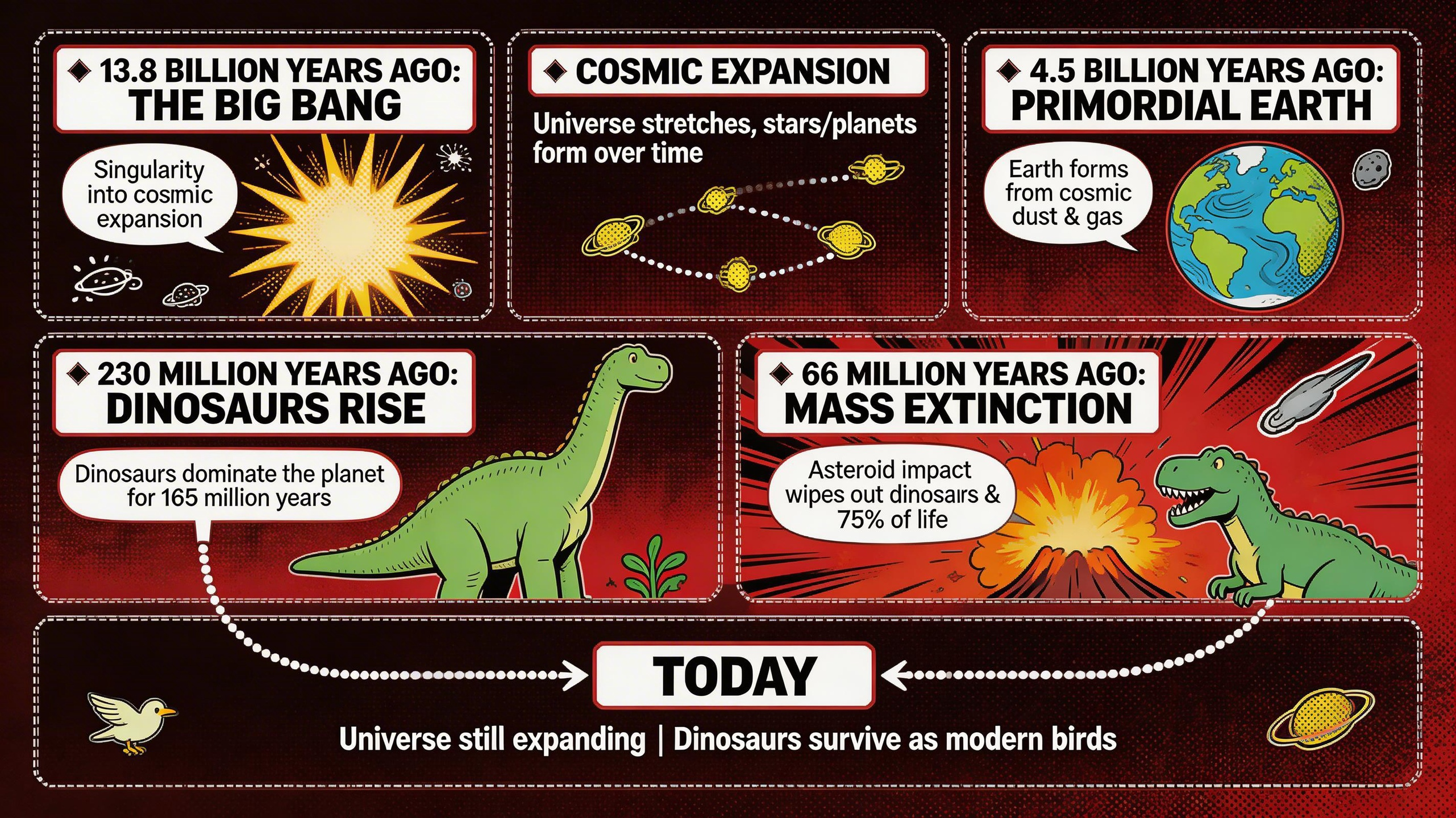 解释大爆炸和恐龙时代的漫画风格信息图,深红和墨黑色背景,大胆的漫画色调。