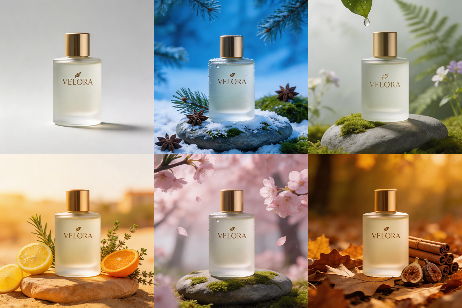 使用参考图像中的瓶子,生成六张不同季节背景的产品照片。六张图片中瓶子设计保持一致。