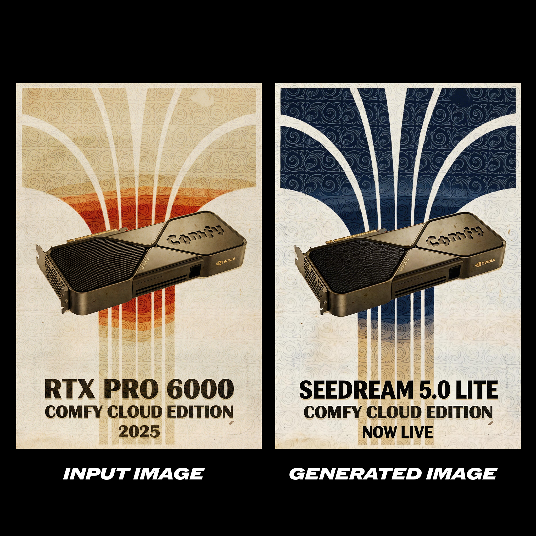 保持原有构图,将整体色调改为海军蓝和白色。将图片中的 “RTX PRO 6000” 改为 “SEEDREAM 5.0 LITE”,将 “2025” 改为 “NOW LIVE”。