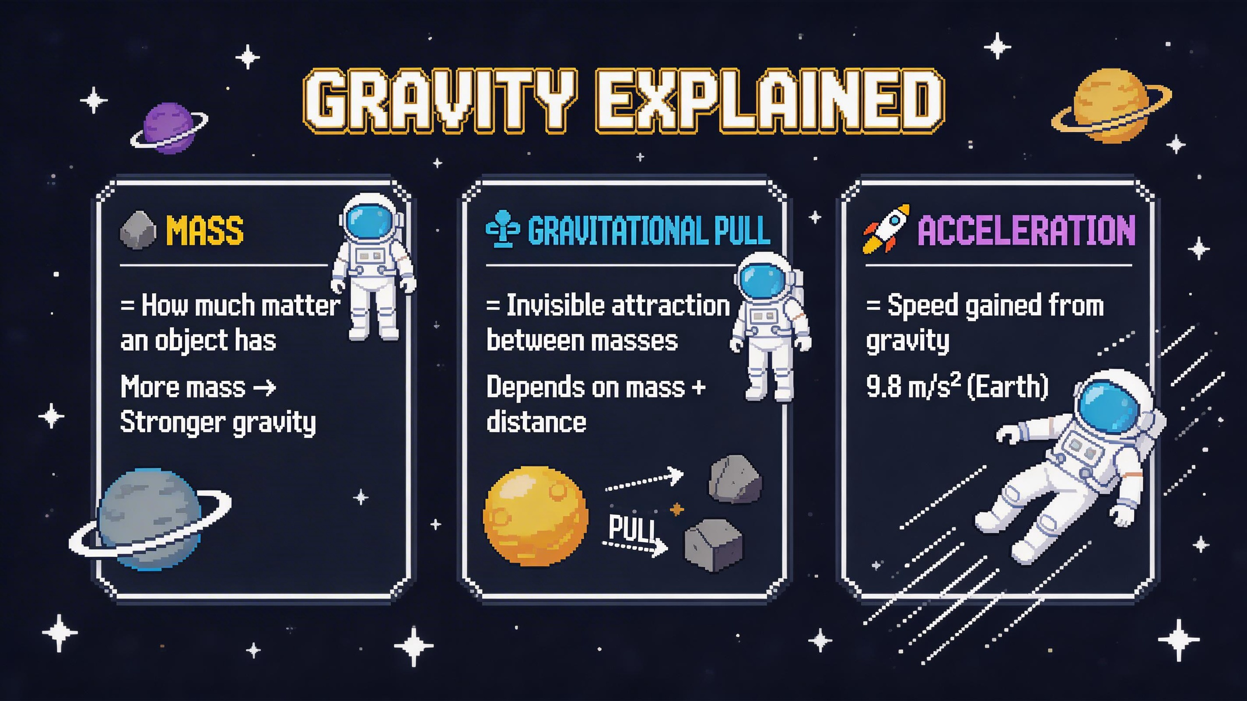 解释重力的像素艺术信息图,以清晰的 16 位风格渲染,深海军蓝/炭灰色背景,大胆的电影色调。